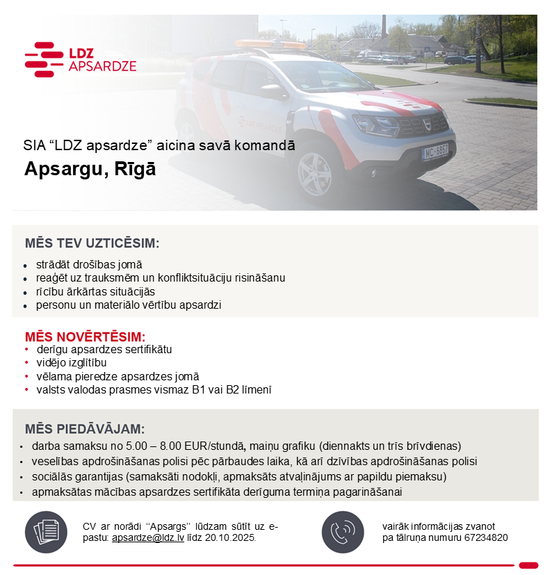 Piesakoties amata vakancei pretendents apliecina, ka sniegtie dati ir patiesi un piekrīt, ka Koncerns “Latvijas dzelzceļš” veiks šo datu apstrādi darbā iekārtošanās nolūkā. Mēs iesniegtos datus uzglabāsim SIA “LDZ apsardze” datu bāzē 1 gadu pēc konkursa beigām ar mērķi nodrošināt savu tiesību aizsardzību. Iesūtot datus, pretendents var izteikt piekrišanu savu datu uzglabāšanai Koncerna “Latvijas dzelzceļš” datu bāzē 1 gadu, lai tos izmantotu arī citos Koncerna “Latvijas dzelzceļš” sabiedrībās piemērotu vakanču personāla atlases procesos. Pēc pretendenta pieprasījuma, personas dati var tikt dzēsti jebkurā brīdī, informāciju sūtot e-pastu – datuaizsardziba@ldz.lv. Vairāk informācijas par personu datu apstrādi: Privātuma politika.